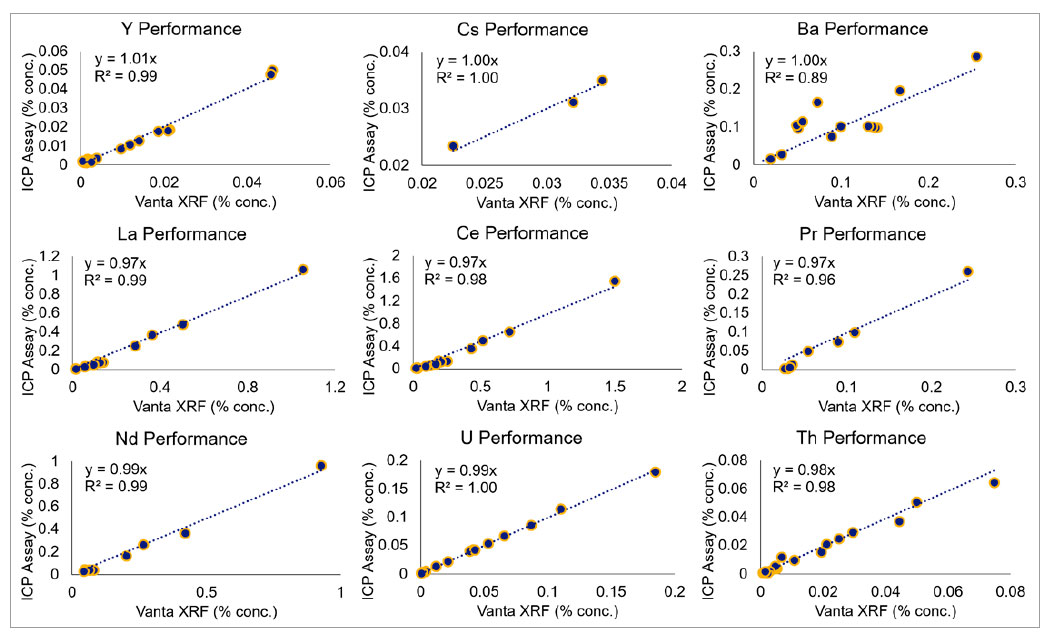 Vanta手持式XRF光譜儀在檢測各種礦石樣品(包括氟碳酸鹽和次生磷酸鹽)時,表現(xiàn)出非常高的性能。氟碳酸鹽通常是氟碳鈰礦石,可提供釔、鈰和鑭;而磷酸鹽通常是獨居石,不僅含有鑭、鈰、鐠和釹,還含有較重的稀土元素釤和釓,以及放射性較弱的釷。正如每個圖表所示,元素的斜率和R2都接近于1,說明Vanta在檢測氟碳鈰礦石和獨居石時均表現(xiàn)出很高的準確性。