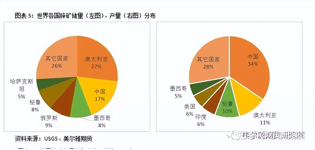 據(jù)美國地質(zhì)勘探局(USGS)2021年的報(bào)告顯示,全球已探明的鋅資源量為19億噸,鋅礦儲量為2.5億金屬噸。其中澳大利亞的鋅礦儲量最為豐富,約占到全球總儲量的27%。中國鋅礦儲量僅排名第二,約占全球總量的17%。其次分別為俄羅斯(占全球的9%)、墨西哥(8%)、秘魯(8%)、哈薩克斯坦(5%)等國。