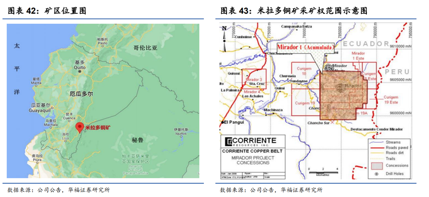 Mirador1(Acumulada)礦區位于厄瓜多爾東南部,礦區面積2985公頃,保有資源量為 12.57億噸,銅品位0.48%,折合銅金屬量約603.05萬噸,礦山還擁有豐富的伴生資源,伴生金品位0.12克/噸,伴生銀資源量772.36百萬噸,平均品位1.314 克/噸。