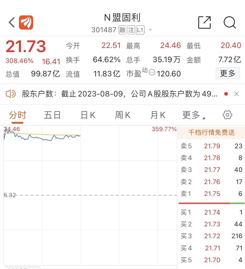 截至上午收盤,盟固利股價報21.73元/股,漲幅308.46%,總市值約100億元。