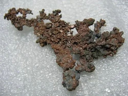 成分Cu,原生自然銅成分中有時含銀和金等。等軸晶系。晶體呈立方體,但少見;一般呈樹枝狀、片狀或致密塊狀集合體。銅紅色,表面易氧化成褐黑色。條痕呈光亮的銅紅色。金屬光澤。硬度2.5~3。具強延展性。斷口呈鋸齒狀。為電和熱的良導體。密度8.5~8.9g/cm3。