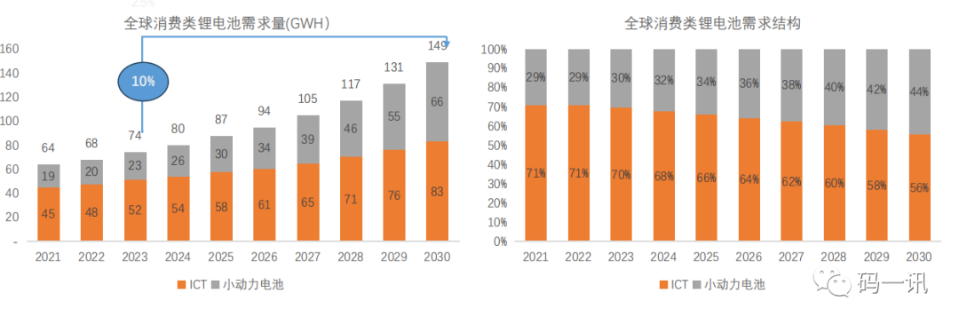 參考多個機構數據,未來消費類電池需求以10%增速發展,預計30年總體需求144GWh, 其中ICT占56%份額,小型動力電池44%;