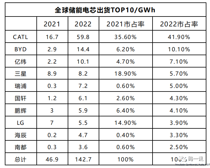 2022年全球大儲的出貨量量達到50GWh,環比21年上漲一倍,預計23年出貨量會繼續保持超過100%的增長。
