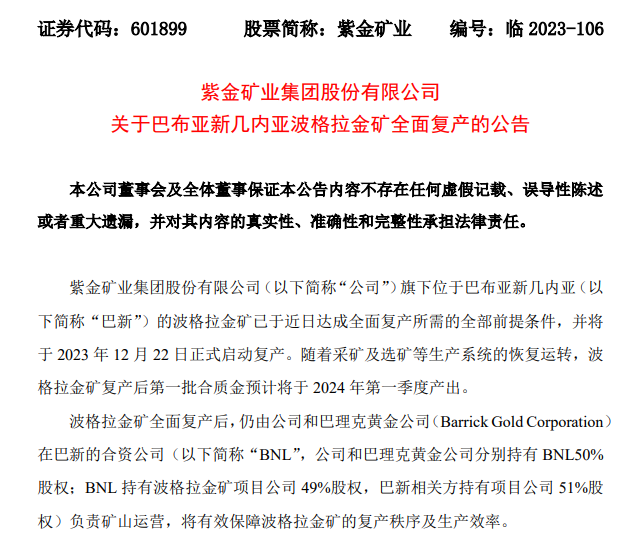 紫金礦業旗下巴布亞新幾內亞波格拉金礦峰回路轉,迎來復產倒計時。12月11日,紫金礦業發布公告,宣布波格拉金礦已于近日達成全面復產所需的全部前提條件,并將于2023年12月22日正式啟動復產,預計將于2024年第一季度產出第一批合質金。