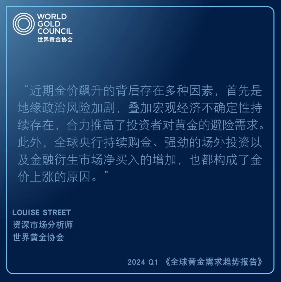 通常情況下,東方市場的投資者對金價(jià)的變動(dòng)更為敏感,傾向于逢低買入,而西方投資者往往會(huì)被金價(jià)上漲的趨勢所吸引,更偏向于追高。但在今年一季度,上述情況發(fā)生了變化,隨著金價(jià)的飆升,中國和印度等市場的投資需求反而大幅增長。”