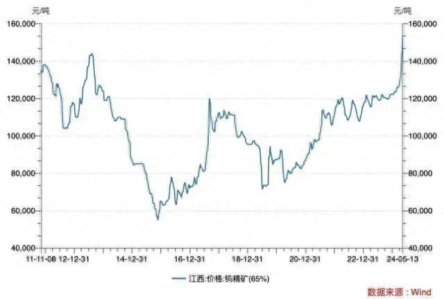 小金屬方面,年初至今,鉬精礦(45%-50%)上漲17.4%,錫上漲24.9%。被譽(yù)為“工業(yè)牙齒”的能源金屬鎢的價(jià)格在近期沖上了十年新高。江西地區(qū)65%品位的鎢精礦在5月13日的均價(jià)達(dá)到了15.35萬(wàn)元/噸,較年初已上漲25%,創(chuàng)下了自2013年以來(lái)的新高。
