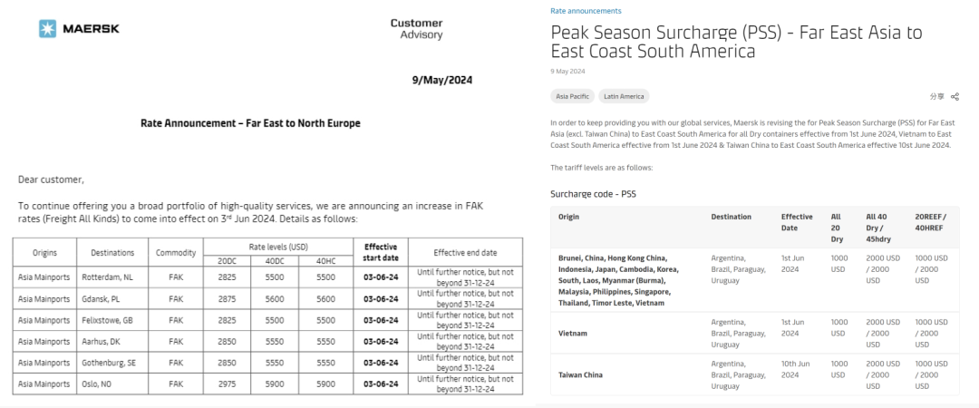 船公司們宣布新一輪運(yùn)價(jià)調(diào)整計(jì)劃,馬士基和達(dá)飛兩大航運(yùn)巨頭已宣布6月再提價(jià)計(jì)劃,上調(diào)北歐FAK費(fèi)率。其中,馬士基每40尺柜最高5900美元,達(dá)飛再次上調(diào)1000美元,每40尺柜6000美元。赫伯羅特、HMM等船公司繼續(xù)調(diào)整部分航線的費(fèi)率,涉及歐地、非洲、南美、北美等。5月上旬美線(運(yùn)價(jià))已經(jīng)連漲了兩次,每次各漲了1000美元左右,漲價(jià)還將繼續(xù),并將在5月下旬飆升到5000美元以上。