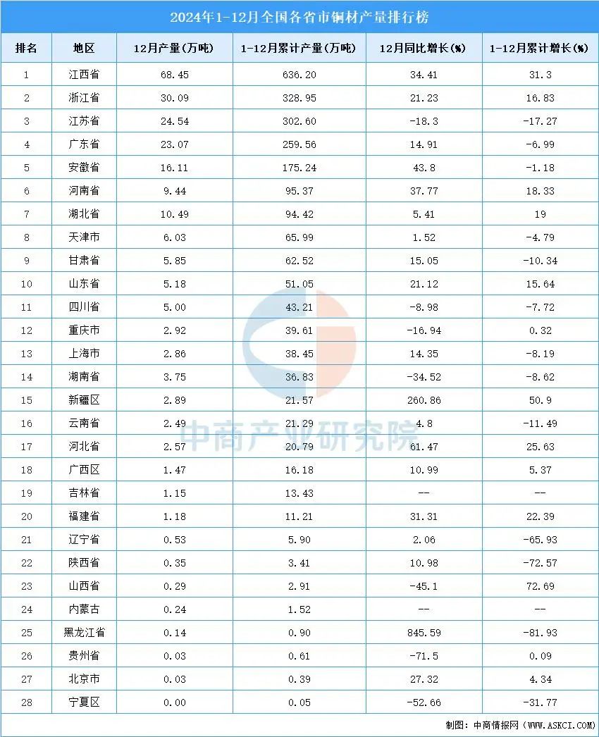 我國銅材產量主要集中在華東區域,占比約為65.68%,其次是華南(11.73%)、華中(9.64%)、西南(4.46%)、華北(3.90%)、西北(3.73%)、東北(0.86%)。共有28個省份生產銅材,前三名占據半壁江山。