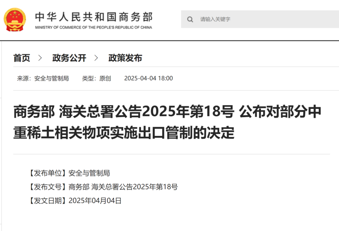 根據《中華人民共和國出口管制法》等有關法律法規,4月4日,商務部會同海關總署發布關于對釤、釓、鋱、鏑、镥、鈧、釔等7類中重稀土相關物項實施出口管制措施的公告,并于發布之日起正式實施。